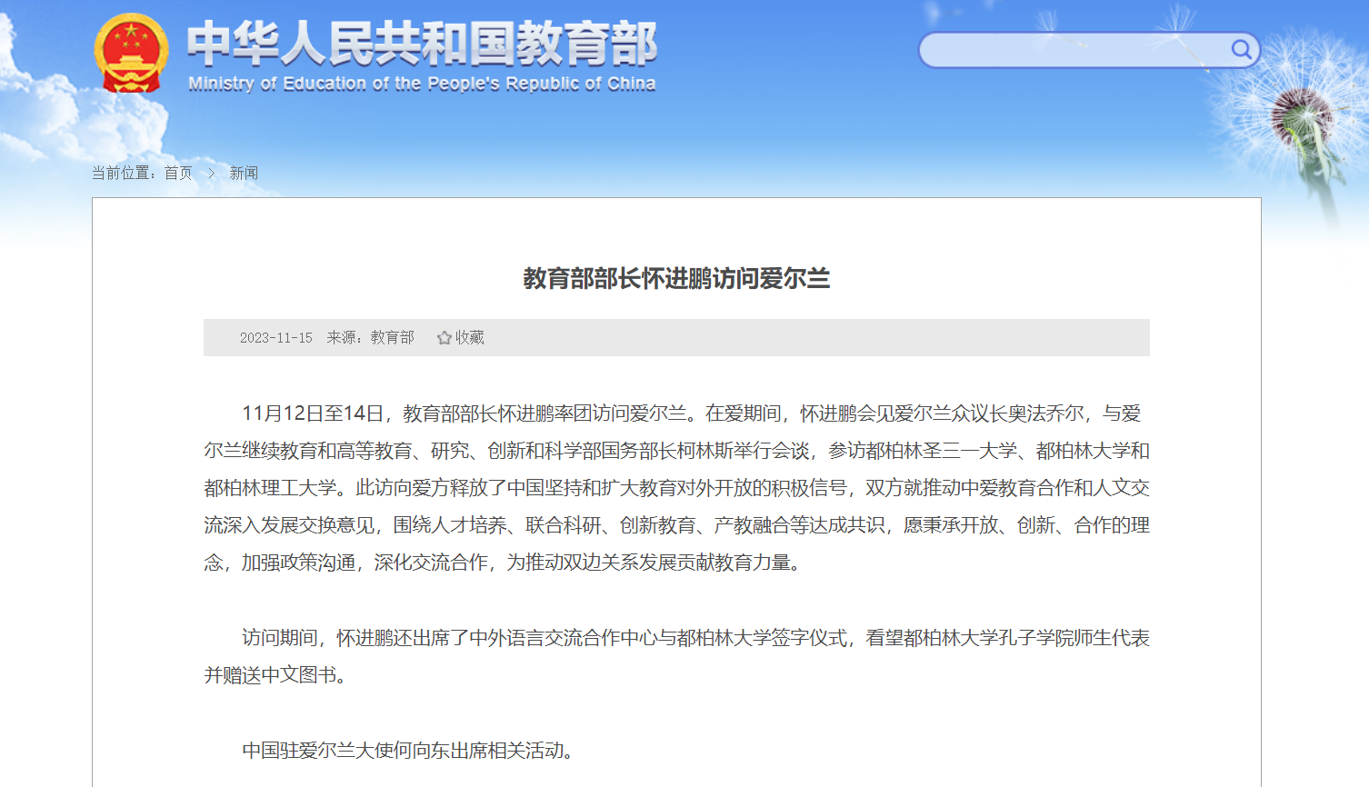 11月12日到14日,教育部部长怀进鹏率团访问爱尔兰。在爱期间,怀进鹏参访了我集团合作办学院校都柏林大学。新闻报道链接如下:http://www.moe.gov.cn/jyb_xwfb/gzdt_gzdt/moe_1485/202311/t20231115_1090661.html