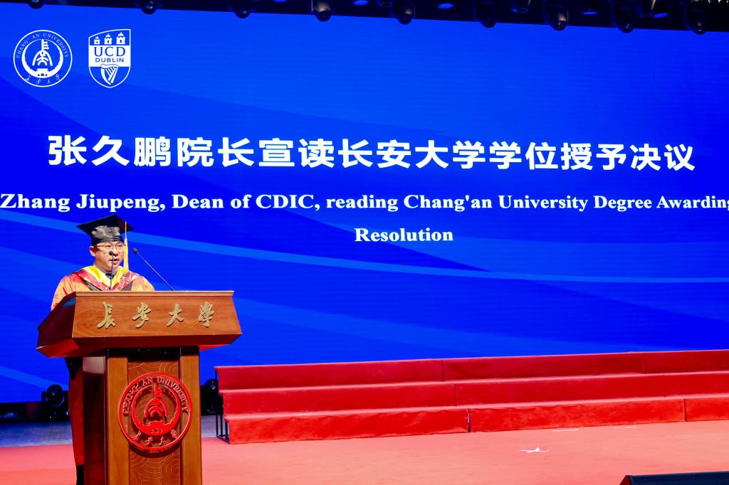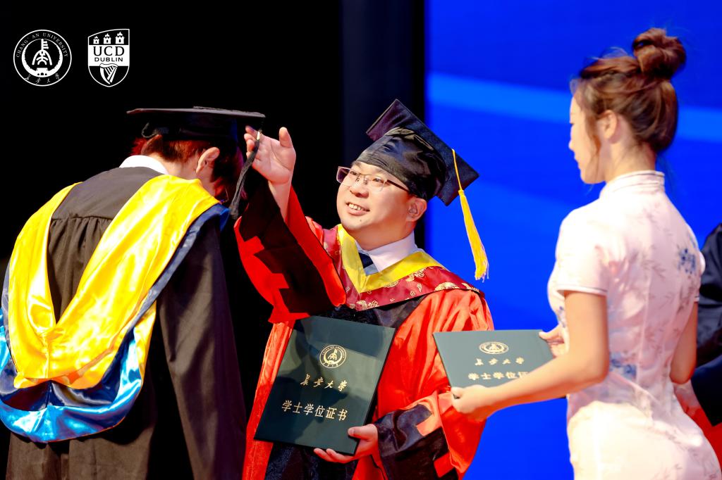 在学位授予环节,Regina Uí Chollatáin教授授予都柏林大学学位,张久鹏宣读太阳成tyc9728学位评定委员会决定并为毕业生拨穗,学院副院长李程宣读毕业生名单。