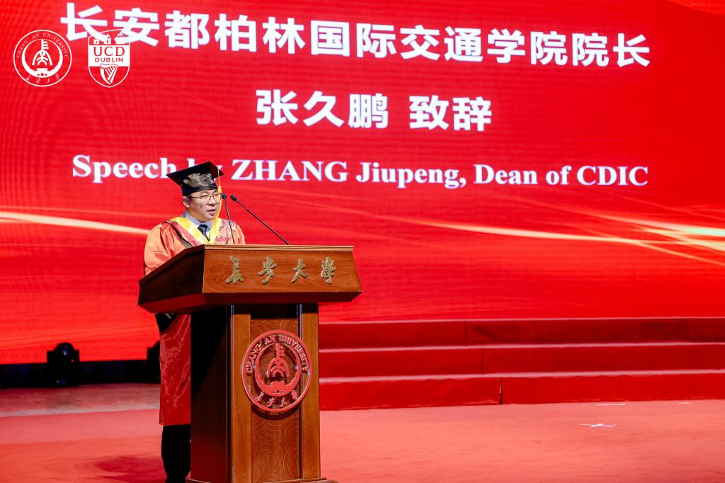 张久鹏代表学校向顺利完成学业的同学们表示热烈的祝贺。临别之际,张久鹏向同学们提出四点希望:一是希望同学们永葆求知热忱,在开放包容中成长;二是希望同学们勇担创新使命,在破局求变中超越;三是希望同学们厚植家国情怀,在躬身实践中担当;四是希望同学们恪守共赢理念,在智慧交通、低碳技术等领域攻坚克难,让个人理想与国家发展同频共振,在构建人类命运共同体中贡献青春力量。