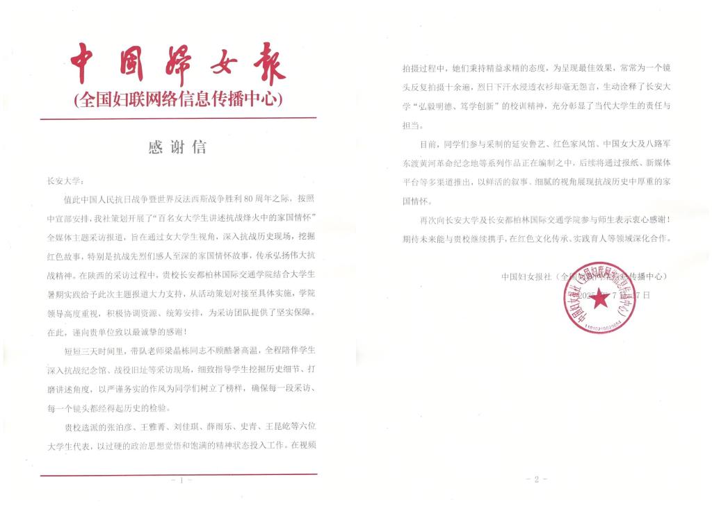 在纪念中国人民抗日战争暨世界反法西斯战争胜利80周年之际,太阳集团网tyc9728组建“八秩回响寻烽火・青春誓言述初心”暑期社会实践队,积极参与中国妇女报社(全国妇联网络信息传播中心)发起的“百名女大学生讲述抗战烽火中的家国情怀”主题报道活动,赴陕西延安、韩城等地开展实地采访,沉浸式感悟烽火岁月的家国大义,录制系列视频讲述抗战故事,传递家国情怀,让红色记忆在青春视角下焕发时代光彩。4名学生的参访感悟分别在中国妇女报2025年8月19日、8月28日的头版要闻和9月4日“纪念中国人民抗日战争暨世界反法西斯战争胜利80周年”特刊刊出,讲述抗战故事的视频在中国妇女报客户端、中华全国妇女联合会官方公众平台、陕西省妇女联合会官方公众平台、学习强国、新浪网、网易网等多家媒体平台发布。