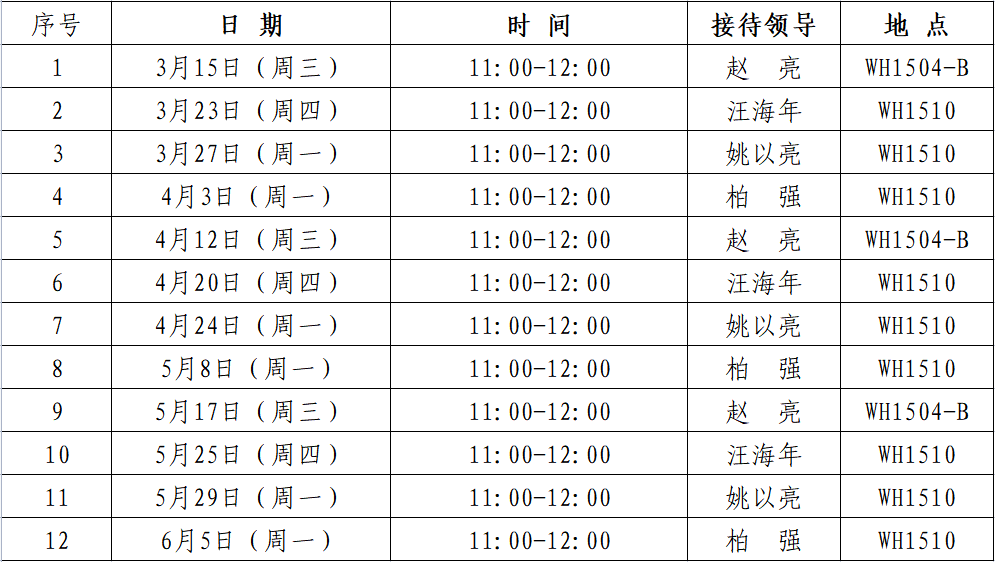 为广泛听取师生员工对学院各项工作的意见和建议,促进学院建设与发展,结合现阶段学院工作实际,现将本学期院领导接待日安排通知如下: