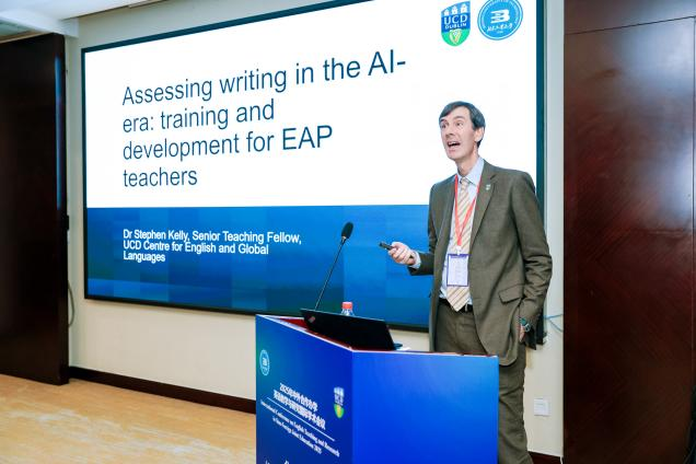 Alex Runchman作题为“中外合作办学英语教学新范式:学术英语、合作与社群的作用”的专题报告。基于学院在EAP教学改革中的实践探索,他提出构建合作办学英语教学新范式的五项关键路径:一是强化以学术英语为核心的课程体系;二是打造中外教师深度协作的教学团队;三是高质量推进跨文化融合的教材内容开发;四是建立基于真实任务与应用情境的评估体系;五是营造沉浸式、社群化的英语学习环境。该报告获得与会专家高度认可,为中外合作办学英语教学模式的创新实践提供了重要参考。Stephen Kelly在平行分论坛作题为“人工智能时代的写作评估:EAP教师的培训与发展”的主题分享,围绕生成式AI赋能学术写作教学、写作评估体系创新以及教师专业发展路径等内容提出前瞻性见解,展示学院在技术支持语言教学方面的探索成果与实践成效。